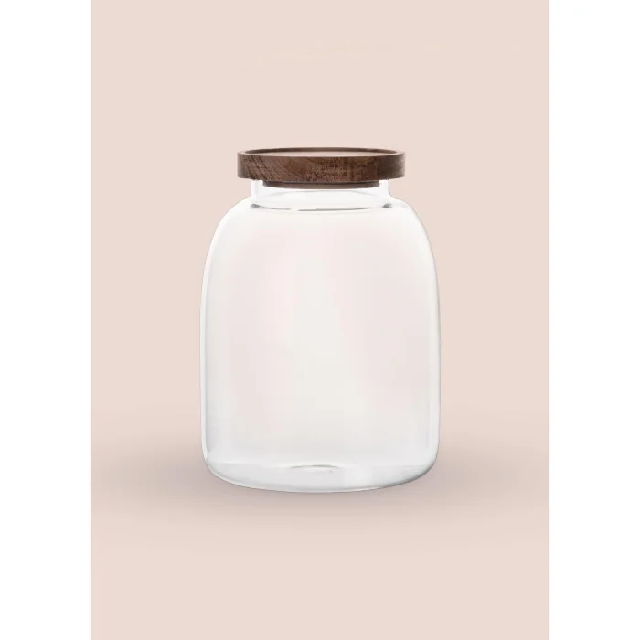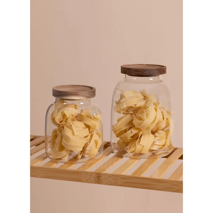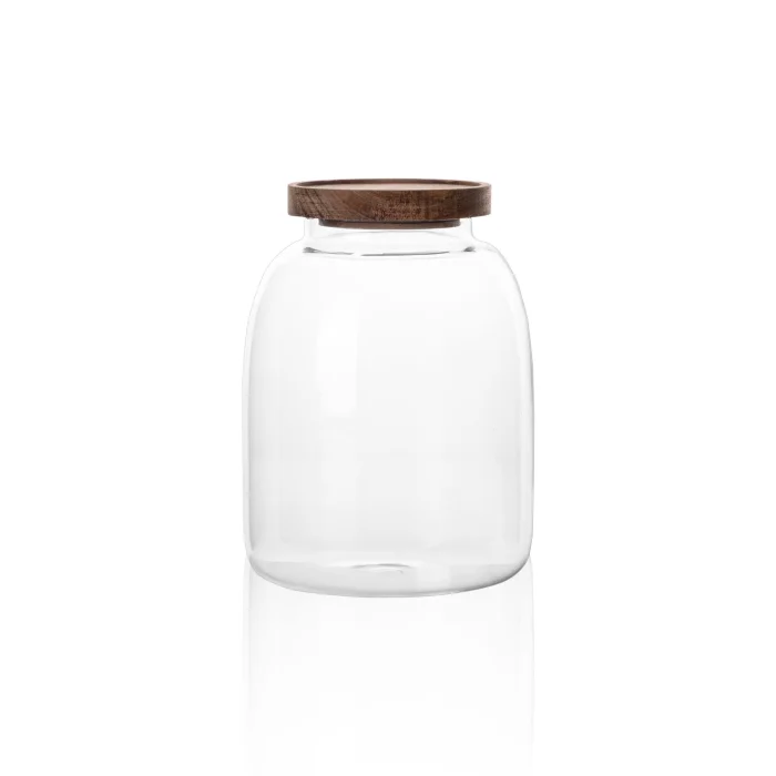 Modern ve fonksiyonel tasarımı ile ahşap kapaklı cam kavanoz, gıdayı saklamak ve sofra kompozisyonunuza zarafet katmak için idealdir.