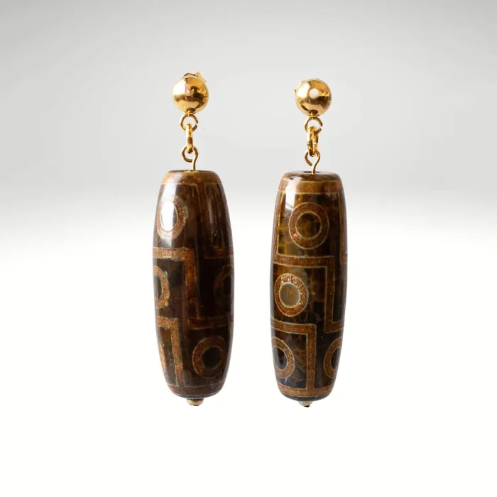 Bu özel tasarımda kullanılan kahverengi Tibet Akik taşı, 9 gözlü Dzi deseniyle birlikte hem spiritüel koruma hem de bolluk ve bilgelik sembolü olarak kabul edilir. 9 göz, Tibet inanışına göre yaşamın tüm yönlerinde başarı, sağlık, uzun ömür ve içsel farkındalık getirir. Kahverengi tonları ise toprağa bağlılık, istikrar ve güven hissi sunar. Theia Gemworks dokunuşuyla hazırlanan bu küpe, geleneksel enerjileri modern ve zarif bir formda taşıyor. Ruhunu güçlendiren bir sembol, stiline anlam katan bir parça.