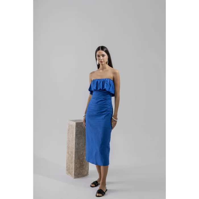 Omzu Açık, Fırfırlı, Arkası Fermuarlı, Mavi Midi Elbise