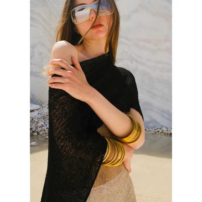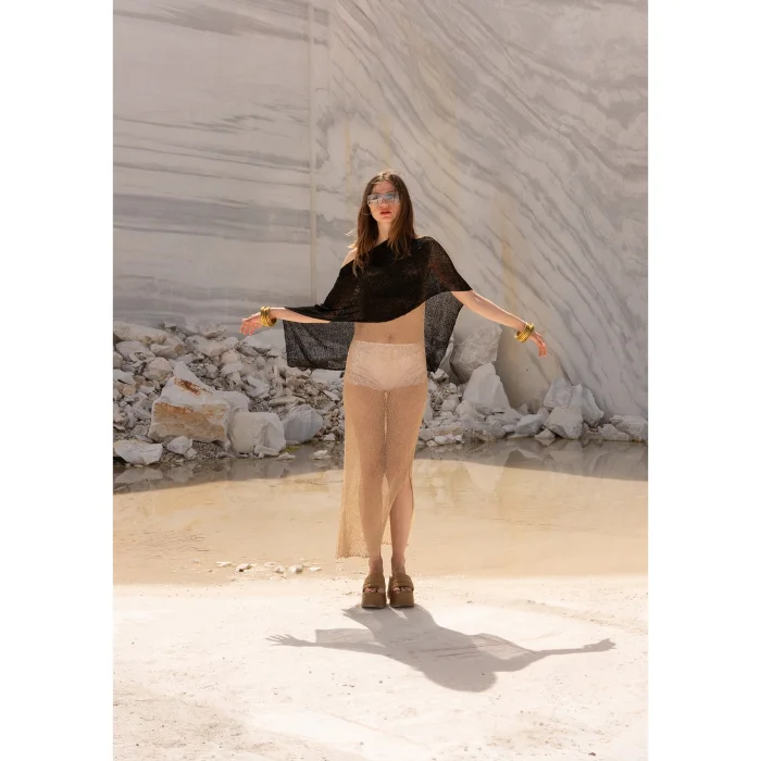 Omuzdan tek parça gibi akan formu sayesinde hareketli ve özgür bir silüet yaratır.