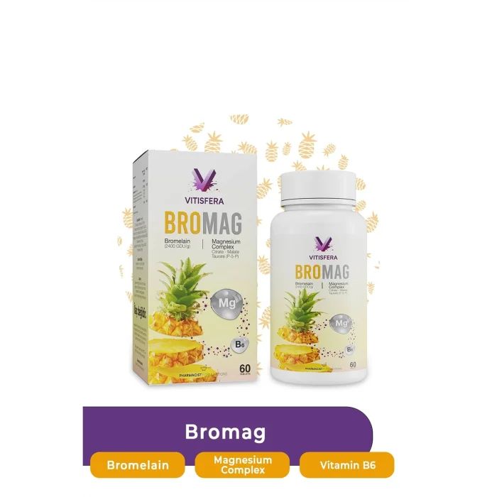 Vitisfera Bromag, 1 tabletinde 500 mg bromelain içerir ve 2400 GDU / g etkinliğe sahiptir. Bromelain, ananas ağacından elde edilen enzimler karışımı olup Ananas comosus bitkisinden elde edilmektedir. Ayrıca, 1 tablette 50 mg magnezyum sitrat, 25 mg magnezyum malat, 25 mg magnezyum taurat ve 2,5 mg Vitamin B6 bulunmaktadır.
