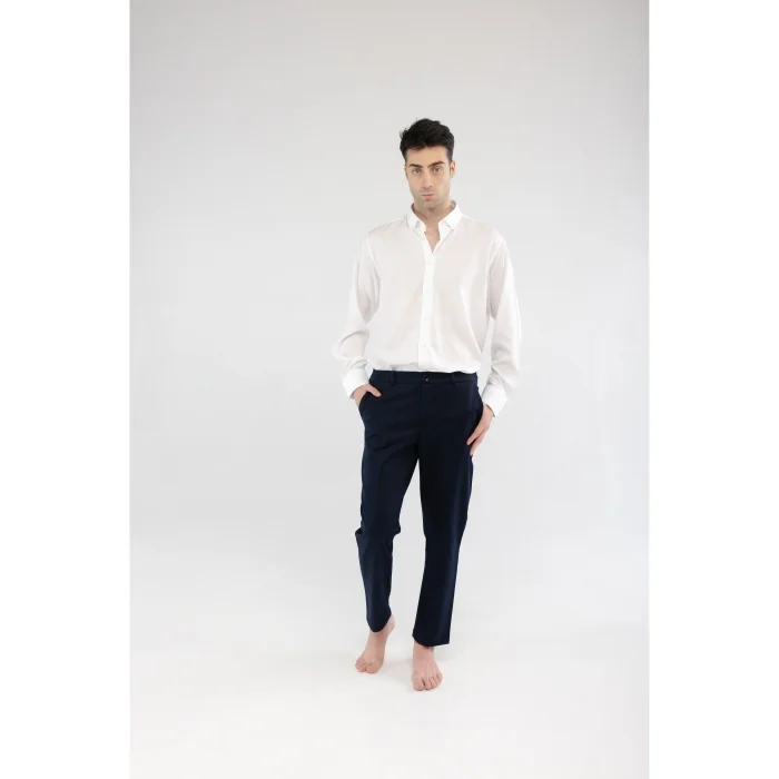Modern şehir stiline konfor katan bu lacivert pantolon, kalın dokulu pamuk kumaşıyla formunu korurken hafif parlak yüzeyi sayesinde zarif bir görünüm sunar. Belin yanlarındaki elastik paneller, hareket özgürlüğü ve gün boyu konfor sağlar. Hafif daralan paça kesimi, klasik ile rahat arasında ideal bir denge kurar.
