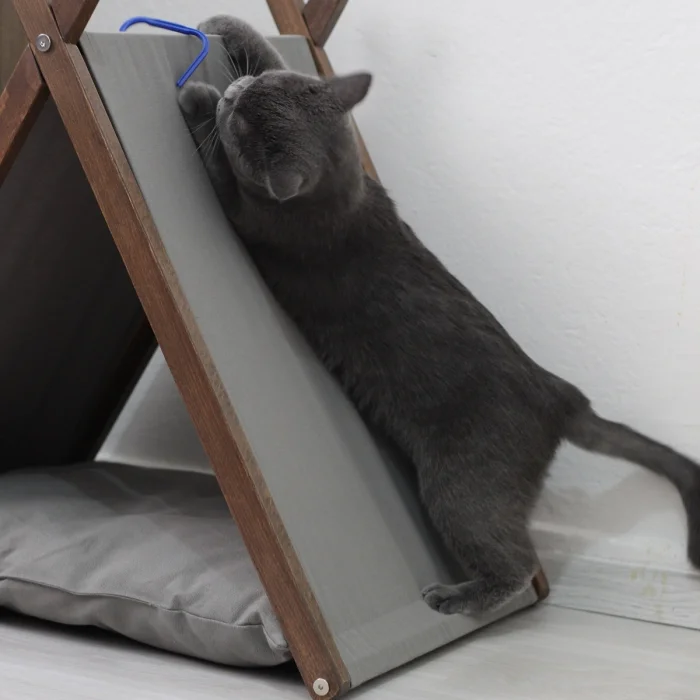 5 Adet Ahşap Aksam, 1 Adet Tente 1 Adet Yastık 6 Adet Alyan Başlı Vida 1 Adet Alyan anahtarı ile demonte gönderilmektedir. Leke tutmayan, kolay temizlenebilen, çamaşır makinesinde yıkanabilen ve kedinizin tırmalamalarına dayanıklı kumaş. Masif kayın ağacından üretilmiş ve ceviz rengi doğal yağ ile sonlandırılmıştır. Ürünlerimiz el işçiliği ile yerel zanaatkarlar tarafından üretilir. Masif ahşaptan üretildiğinden dolayı budak yeri ve renk tonu gibi ufak farklılıklar gözlemlenebilir.