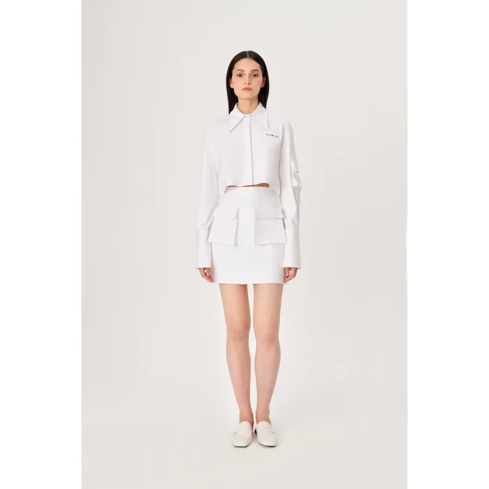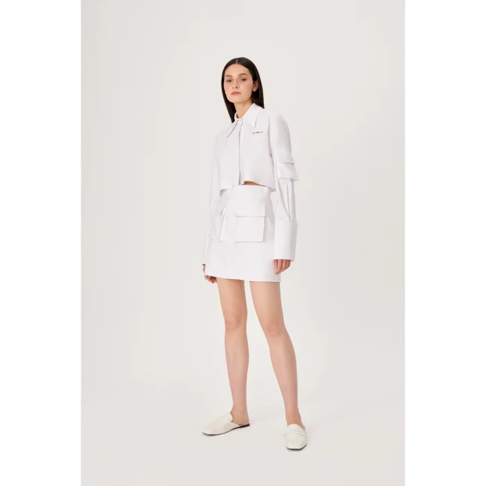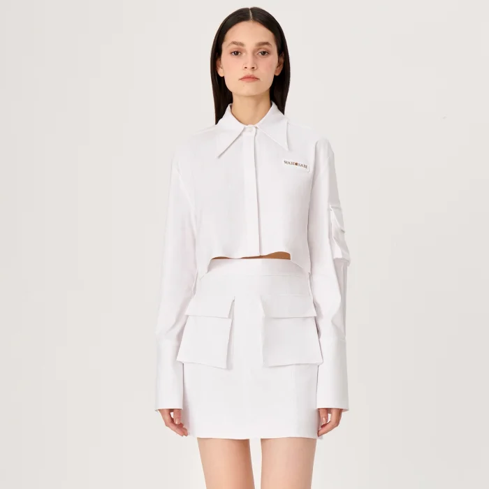 Uzun Manşetli Gömlek, Luce Del Sole’nin zamansız ve Modern kodlarını sergiliyor. Gömlek Geniş yaka detayı ve önü düğmeli kapatma ile geliştirilmiş kısa bir kesime sahiptir.Ön kısımda ‘WABISABI’ imzalı Nakış logo süslenmiştir.Özel bir görünümü tamamlamak için koleksiyondan kısa bir etekle şekillendirilebilir.