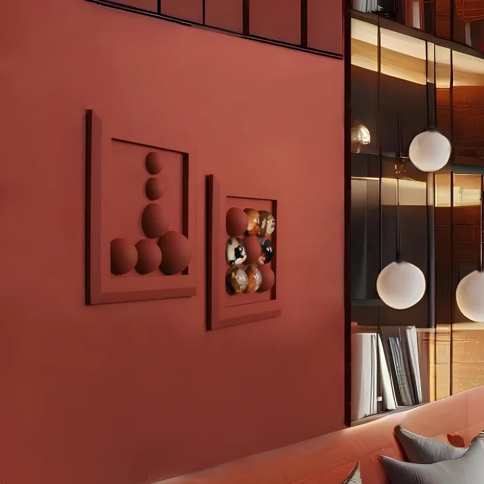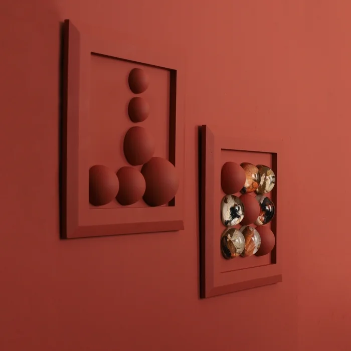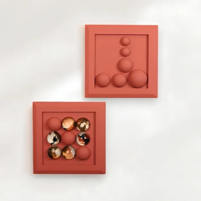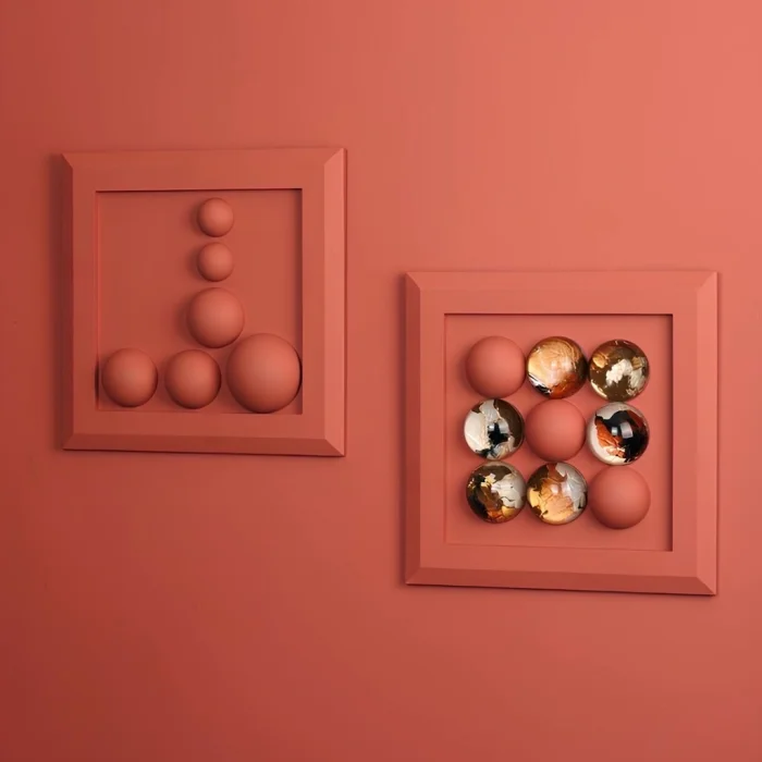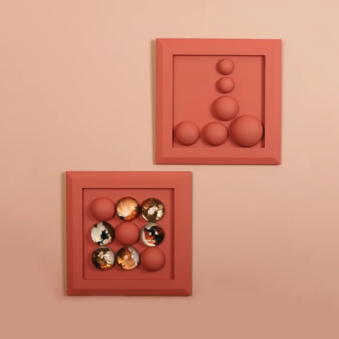 9 adet irili ufaklı kiremit renginde boyanmış “Wallipop” ürünü ile 6 adet siyah, bakır ve gold tonları ağırlıklı “Wallipop Art” ürünlerinin yerleştirilmiş olduğu 31x31 cm ölçülerinde ölçülerinde kiremit renginde ahşap kalın çerçeveli panodan oluşmaktadır. 2'li settir.
