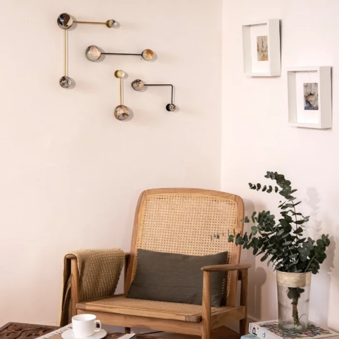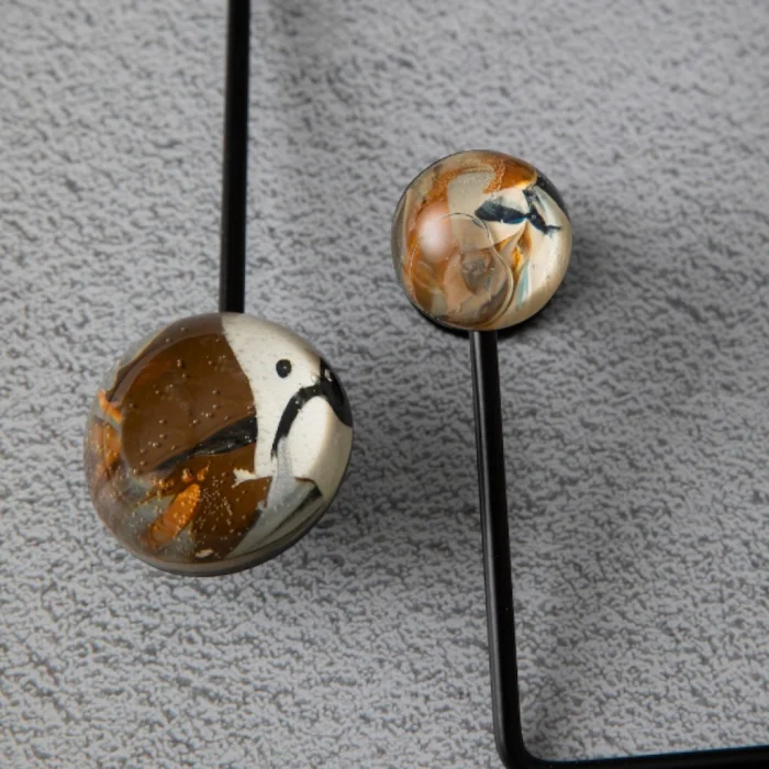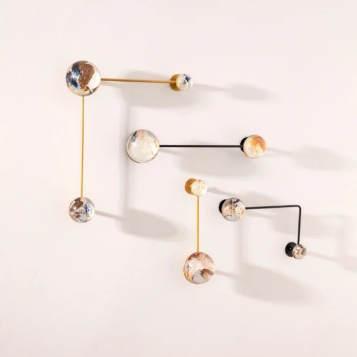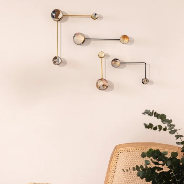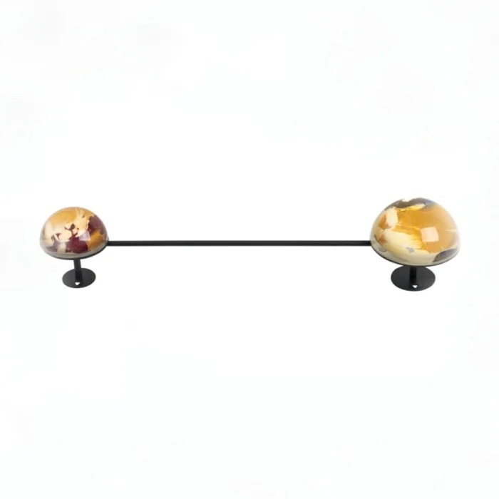 ÖNEMLİ NOT: Yarım kürelerin içindeki görseller tek tek ve elle uygulandığından, her biri birbirinden farklıdır ve görseldekiyle değişkenlik gösterebilir. Yarım küre üzerindeki baloncuklar malzemenin doğasından kaynaklanmaktadır. Demir profiller görseldeki gibi iki adet siyah iki adet gold renktedir.
