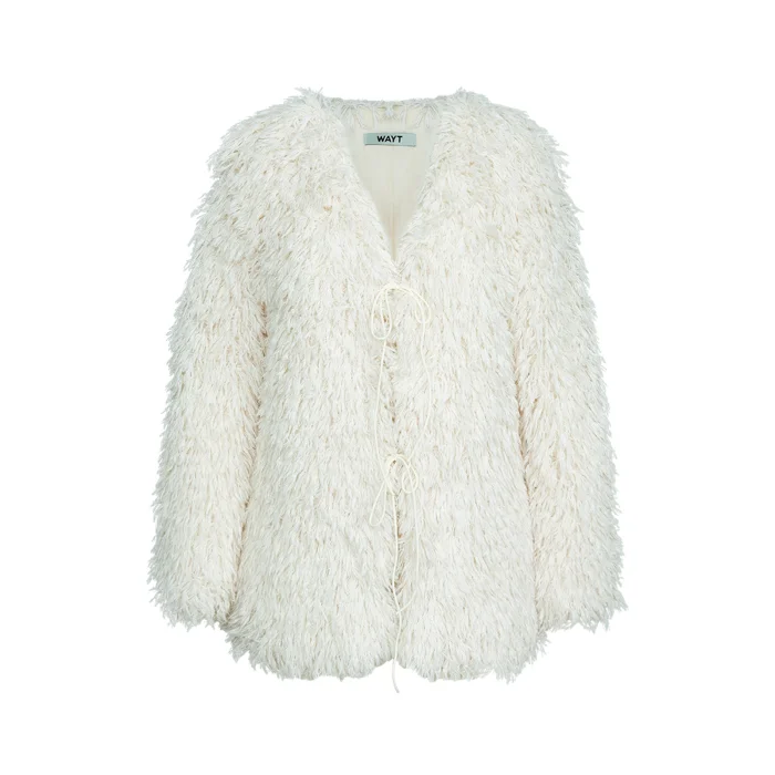 Kırık beyaz tonlarında, lureks ışıltısıyla hareket kazanan tüy dokulu kumaş