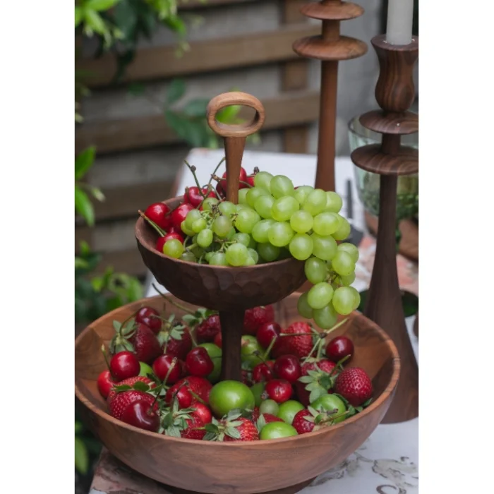 Unique 2 katlı sunum çanağı. 2 farklı uygulamayla hazırlanan katlı servis ceviz ürününüzü meyve, tatlı, kestane ve bir çok ikramınızda rahatlıkla kullanabilirsiniz. Masif ürünler kendi içlerinde doku farklılıklarına sahiptir, bu sebeple her ürün için farklı doku ve görüntü doğaldır. Ürünlerin tamamı el işçiliği ile üretildiğinden, bıçak payları ve kaplama Kalınlıklarında oluşabilecek farklılıklardan dolayı, ölçülerde milimetrik farklılık gözlemlenebilir.