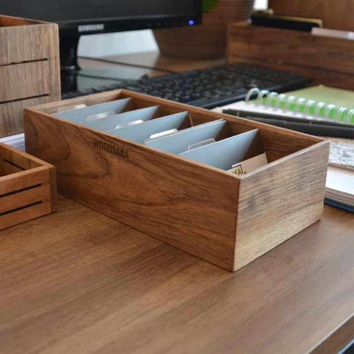 Woodsaka Gobi Kartvizit Organizer - Ceviz Ölçüler: 20.8cm x 10.4cm x 6cm Ürün Özellikleri: Gobi kartvizit organizer sahip olduğu altı bölümü ile kartların en iyi şekilde organize edilmesine yardımcı olur. Her bir kartvizitlik bölümü yaklaşık yetmiş beş adet kart alır. Bölüm ayraçları istendiğinde çıkarılarak daha büyük malzemeler için geniş alanlar elde edilebilir. Organizeri doğal ceviz ağacından ürettik. Bölmeleri ayırmak için ise şeffaf pleksi kullandık. Ahşabın korunması, kimyasal içermeyen doğal yağ ile sağlanmıştır. Kullandığımız yağ, AB tarafından verilen EN71-3 insan ve çevre dostu ürün sertifikasına sahiptir. Malzeme: Ceviz Önemli: Bu ürün, kalemlik, not kağıdı kutusu, ataçlık, kartvizitlik, yatay saklama kutusu ve A4 kağıt ve evrak tepsis içeren Gobi Masaüstü Seti'nin bir parçasıdır. Set olarak yan yana veya üst üste kullanabilir, masanızı organize edebilirsiniz. Not: Bu ürün doğal malzemelerden üretilmiştir. Kullanılan ağacın renk ve çizgileri, örnek fotoğraflarla farklılık gösterebilir. Ürün el ile montaj edilmiş ve zımparalanmıştır. Ölçülerde küçük değişiklikler olabilir.