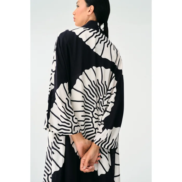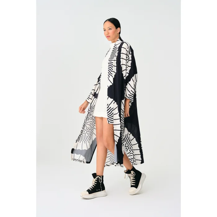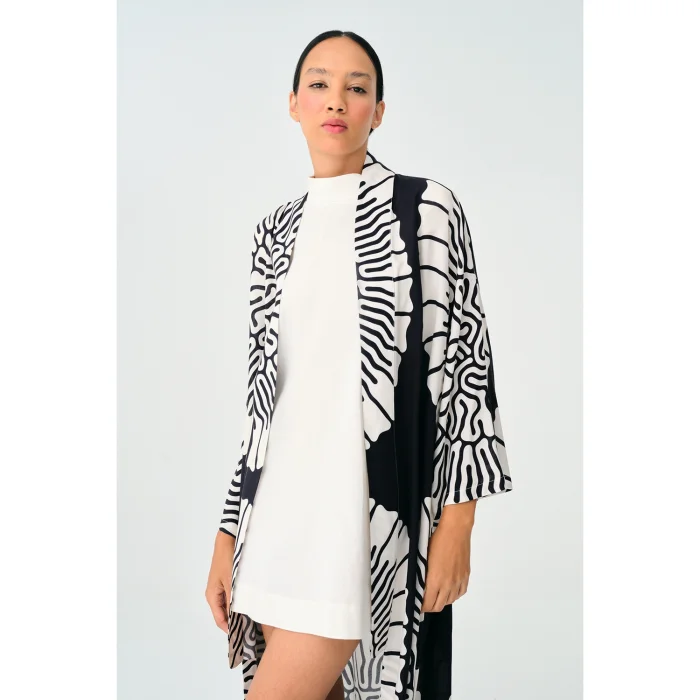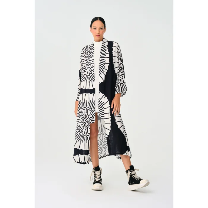 İpliği %100 organik malzemelerden seçilmiş bir elyaf türü olan viskon kumaş kullanılarak üretilmiştir. Model, 78/60/90 vücut ölçülerine sahip ve 180 cm boyundadır.