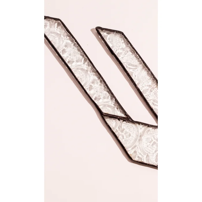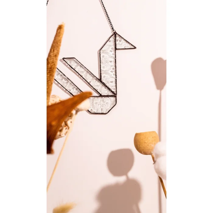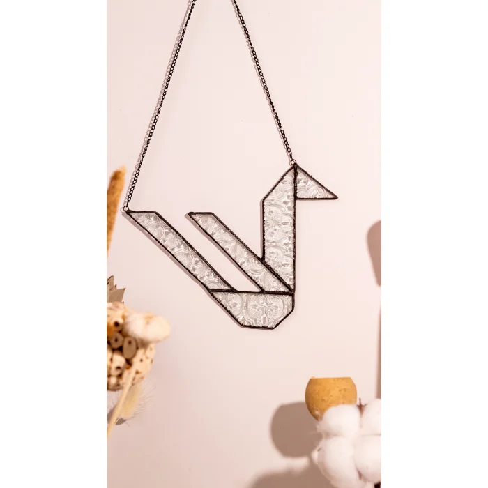 Kadim Motifler Serisi’nin bu el yapımı vitray parçasında kuş formu, yalın ve köşeli geometrik hatlarla yorumlanmıştır. Kullanılan cam, geçmişte Türkiye’de ev kapılarında ve iç mekânlarda sıkça kullanılan çiçek kabartmalı şeffaf camdır. Bu cam, eski evlerin ışıkla kurduğu ilişkiyi ve gündelik hayatın içindeki sade estetiği hatırlatır. Işığı süzen yapısıyla kuş motifine hafiflik ve zarif bir hareket hissi kazandırır.