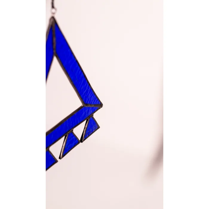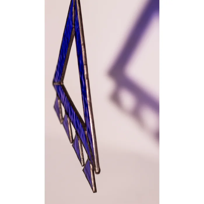 Kadim Motifler Serisi’nin bu el yapımı vitray parçasında tılsım motifi, üçgenin güçlü ve dengeli formu üzerinden yeniden yorumlanmıştır. Kullanılan derin mavi cam; korunma, sezgi ve sakinliği simgelerken, alt bölümde yer alan küçük üçgenler motifin koruyucu etkisini çoğaltan katmanlar olarak tasarlanmıştır. Bütün form, bir tür enerji sembolü gibi çalışır.