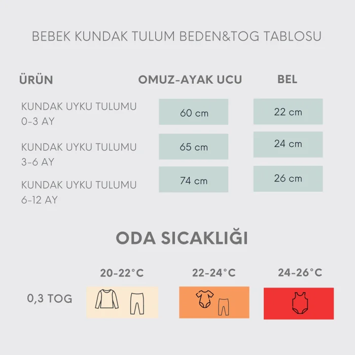 Bebek Kundak Uyku Tulumu, 0,3 Tog değerindedir. Organik pamuktan üretilmiş ve GOTS sertifikalıdır. Çift yönlü fermuarı ve kol çıtçıtları ile saniyeler içinde bebeğinizi kundaklayabilirsiniz. Dilerseniz kolları açık olarak da kullanabilirsiniz.Bebeğinizin anne karnındaki duruş pozisyonuna uygun olarak kundak şeklindedir, bebeğinizin göğsünü sarmalar; sakinleştir ve güven verir. Özellikle ilk aylarda görülen ve bebeklerin sık uyanmasına neden olan Moro refleksine bağlı ani irkilmeleri azaltır.0,3 Tog uyku tulumunu 21-24 derece oda sıcaklığında bebeğinize uzun kollu body ve alt pijama/pantolon ile; 24-26 derece oda sıcaklığında yarım kollu veya kolsuz bir body ile; 26 derece oda sıcaklığında kolsuz bir body giydirebilirsiniz.Her iki tarafa da esneyen kumaşı ile bebeğinizin hareketlerini kısıtlamaz. Kese şeklindeki tasarımı ile kalça çıkığını engeller ve bacakların rahat hareket etmesini sağlar.Doğal kumaşı sayesinde tog değerine uyumlu oda sıcaklığında bebeğin vücut sıcaklığını sabit tutar, üşümesini engeller. Battaniye olmadan bebeğinize güvenli ve konforlu bir uyku sunar.Çift yönlü fermuarı ile bebeğinizi uyandırmadan bez kontrolü yapabilir ve altını değiştirebilirsiniz. Fermuar başlangıç ve bitiş noktalarının bebeğinizin tenini incitmemesi için fermuar korumaları tasarlanmıştır.Kol çıtçıtları nikel içermez. Açılıp kapanabilen çıtçıtları sayesinde kundaktan uyku tulumuna geçişi kolaylaştırır. Çıtçıtların bebeğinizin tenine değmesini engelleyen ekstra pamuk çıtçıt koruma katmanı bulunur.Uyku tulumu bebeğinizin üzerine oturması ve sarması gerektiğinden kendi bedenine uygun ürünü almanızı öneririz. Ürün beden tablosu şu şekildedir;Beden Ölçüleri: 0-3 ay omuzdan ayağa ürün uzunluğu: 59 cm - Göğüs: 22 cm Kilo: 2,5-6 Kg 3-6 ay omuzdan ayağa ürün uzunluğu: 64 cm - Göğüs: 23 cm Kilo: 6-9 Kg 6-12 ay omuzdan ayağa ürün uzunluğu: 74 cm - Göğüs: 25 cm Kilo: 9-12 Kgİçerik:%95 Organik Pamuk %5 Elasten Türkiye’de üretilmiştir. Ürün doğal içerikli organik pamuk ipliğinden üretildiğinden yıkama ve kullanım kaynaklı renk değişiklikleri görülebilir. (Yumuşatıcı ile yıkama, bebek yağı kullanımı, yüksek sıcaklıkta yıkama vb.