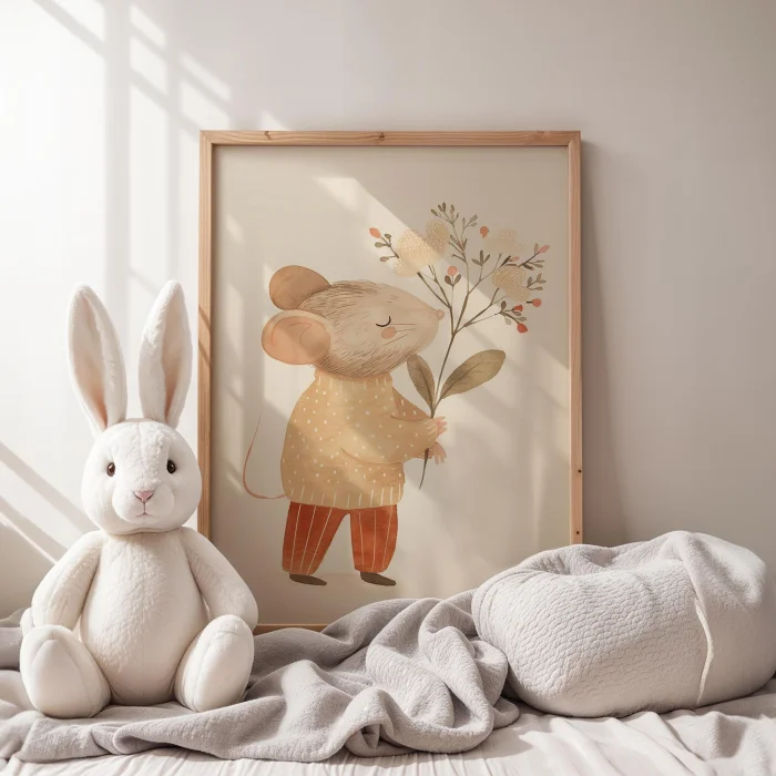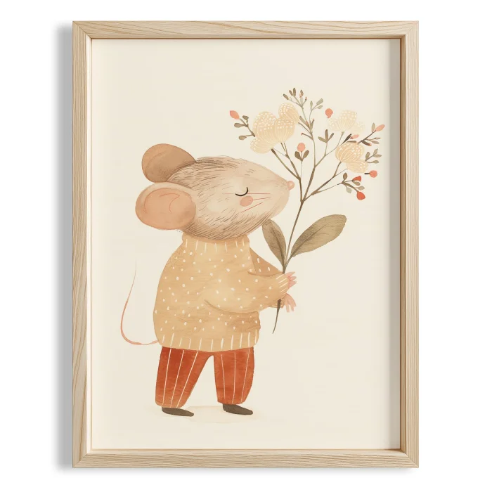 Product: Cute Mouse Holding Flower Branch Kids Room Wooden Wall Art