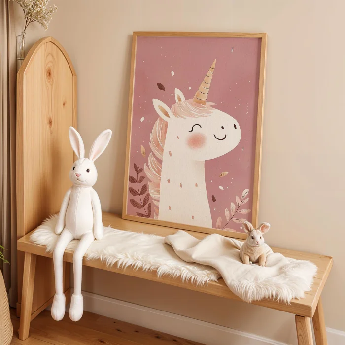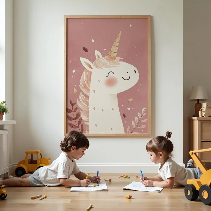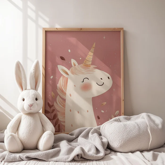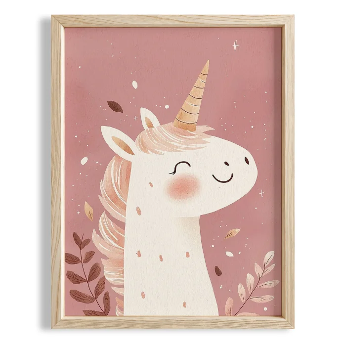 Product: Pink Arka Background Unicorn Büyüsü - Children's Room Wooden Framed Wall Art