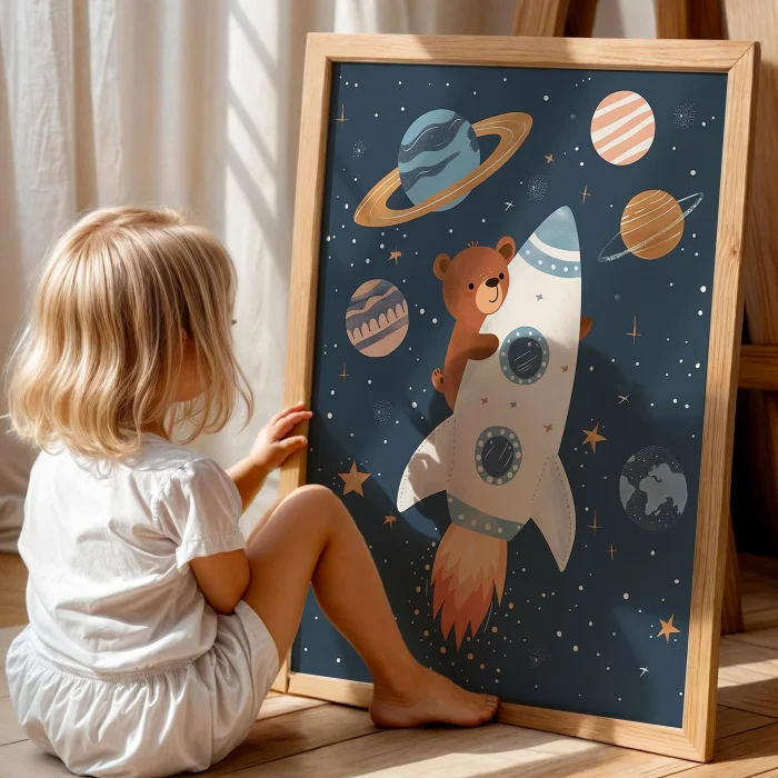 Product: Teddy Bear Rocket Stars And Planets Space-themed Boys' Room Wooden Wall Art