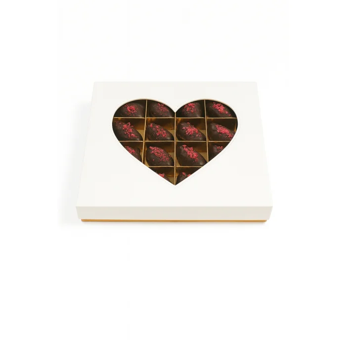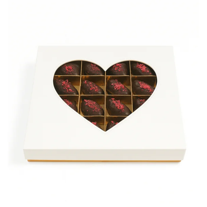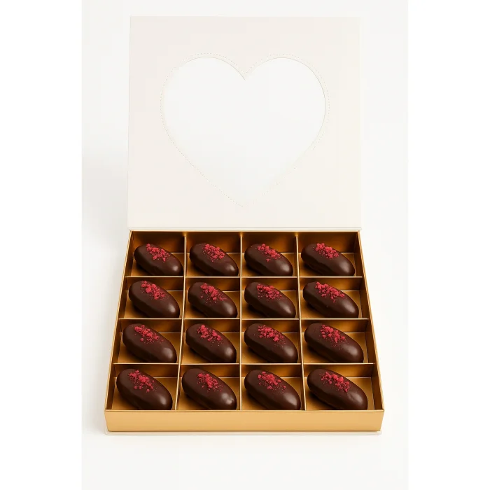 Product: Box Of Belgian Chocolate Dates With Tahini And Almond Filling | Heart Box I Gluten-free And Vegan | 16 Pieces