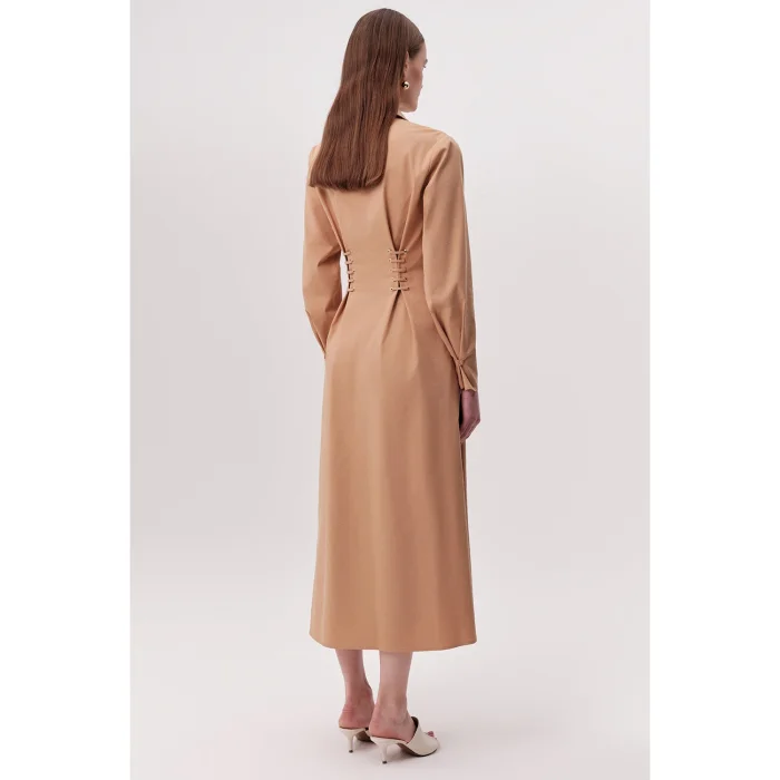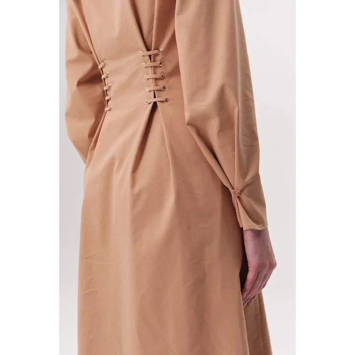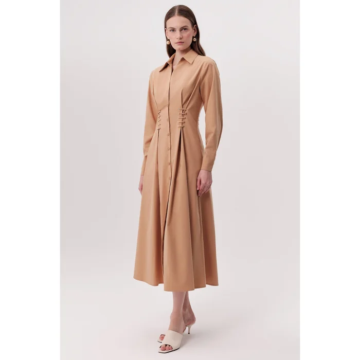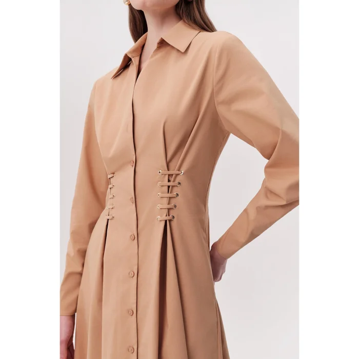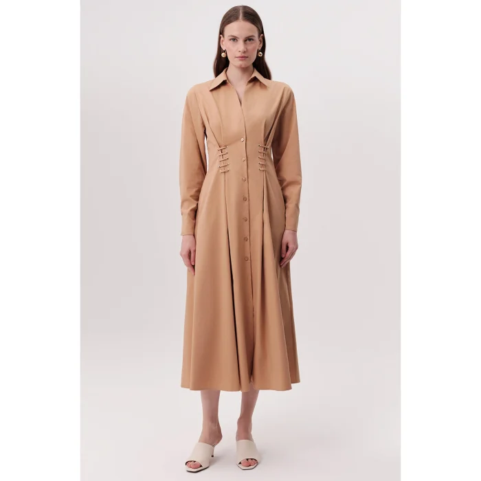Bird's Eye Detailed Pocket Shirt Collar Regular Midi Camel Dress is a piece that stands out with its elegant and modern design. It aims to add value to every wardrobe with its classic cut and contemporary details. The shirt collar and button front detail give the dress a refined look, while the bird's eye and lace detail on the sides add a unique atmosphere to the design. Combined with the timeless appeal of camel color, this dress is ideal for both daily use and special occasions to complete your elegance. The dress's regular cut and midi length adapt to different body types, offering comfortable wear all day long. This dress is a versatile option for an elegant business dinner, a special evening invitation or a casual weekend elegance. Bird's eye and lace details on the sides help you create a more feminine silhouette by emphasizing the waist area. This adjustable detail allows you to tailor the dress to your personal preferences. With a design that prioritizes practicality, hidden pockets allow you to carry small items such as keys, cards, or phones conveniently. This feature makes the dress both stylish and functional. Camel color can be easily combined with a wide range of accessories and shoes. Whether you create a classic and formal style with heels or achieve a modern and casual look with sneakers, this dress successfully adapts to different styles. Offering long-lasting use thanks to its quality fabric and careful workmanship, this dress combines timeless elegance and comfort. With this dress, you will feel both comfortable and stylish.