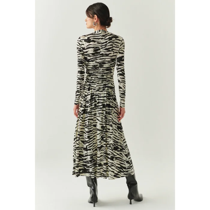Standing out with its elegant silhouette, this double-breasted collar dress exudes a modern stance with its contrasting zebra pattern in black and bone tones. Thanks to its flexible knitted fabric, it offers comfort all day long, while its slim fit cut fits the body and gives a feminine look. This piece, which is an ideal option for seasonal transitions with its midi length and long sleeves, can be easily combined with heeled boots or elegant stilettos.