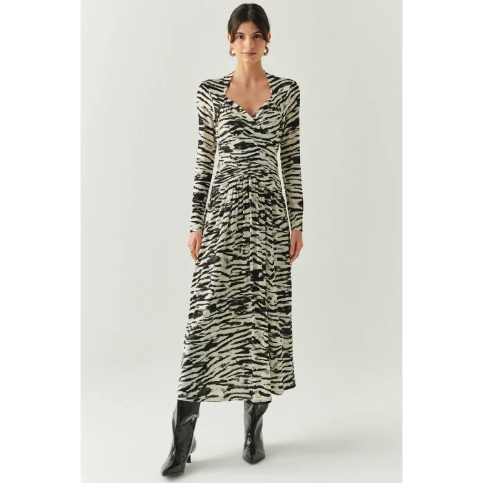 Standing out with its elegant silhouette, this double-breasted collar dress exudes a modern stance with its contrasting zebra pattern in black and bone tones. Thanks to its flexible knitted fabric, it offers comfort all day long, while its slim fit cut fits the body and gives a feminine look. This piece, which is an ideal option for seasonal transitions with its midi length and long sleeves, can be easily combined with heeled boots or elegant stilettos.