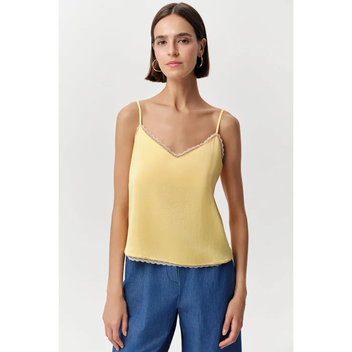 regular satin yellow blouse with lace strips and rope straps is a stylish and comfortable option that fits into your wardrobe. Designed with thin rope straps and V-neck detail, this model offers a look suitable for both day and night use thanks to the slight shine of its satin fabric. The vibrant yellow color and detail of the white lace ribbon give the product a modern and feminine style. This blouse, which exhibits a comfortable stance with its regular cut, is suitable for daily use, offers a cool and fresh use, especially in hot weather, and combines style and comfort. This blouse easily matches different pieces in your closet. It can be combined with jeans, shorts or skirts to achieve a daily and comfortable look. For a more special event or dinner, a more formal and elaborate style can be created by combining it with stylish trousers and high heels. The soft texture and lightweight structure of the fabric provide comfort even during long-term use, while the rope strap design offers a high level of freshness on hot days. The lace detail on the V-neck of the blouse adds a unique atmosphere to this piece, completing the overall look and offering a striking feature. Designed for women who prefer both comfort and style in their wardrobe, this yellow blouse is an option suitable for current trends. While it exhibits a dynamic stance with its vibrant color, it also complements your style with its lace and satin details. It is a versatile piece that can accompany you both in daily life and in your special moments. It is an ideal option for those who want to follow fashion without sacrificing comfort. It is a piece that can take its place in your wardrobe with its ease of use and the texture of its fabric, allowing for different combinations. This blouse can adapt to any environment by offering flexible combination options and helps you express your personal style.