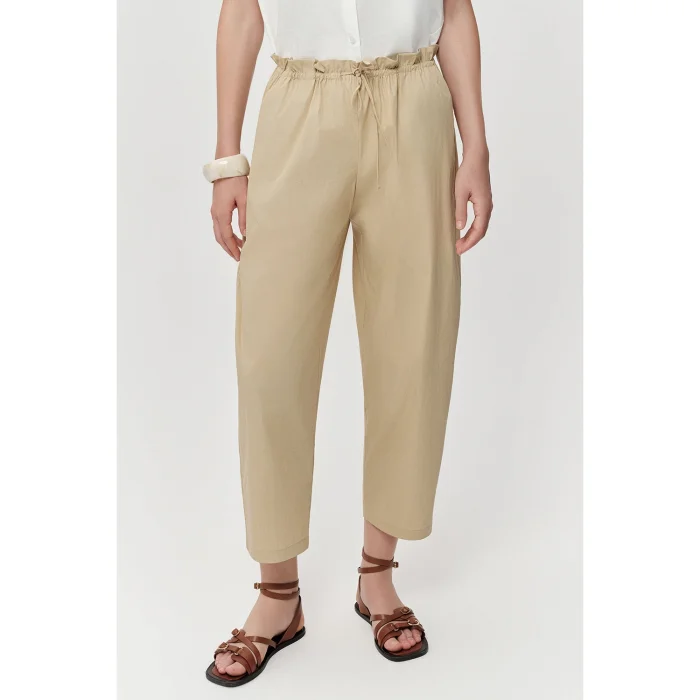 Tight Leg Regular Woven Beige Trousers with Lace-Up Waist Pockets are a candidate to be an important complement to your daily wardrobe by skillfully combining comfort and modern elegance. While it offers a contemporary silhouette with its regular cut and narrow leg model, it provides a personalized fit and all-day comfort thanks to the adjustable laces at the waist. Its timeless beige color can be effortlessly combined with all kinds of tops and offers ideal flexibility for use in both sports activities and more elaborate occasions. Its breathable woven fabric makes you feel good, giving you a feeling of lightness and freshness, especially on your active days. One of the most distinctive features in the design of these pants is the adjustable waist lace. This detail not only adds an aesthetic touch but also increases your freedom of movement by guaranteeing that the trousers fit perfectly around your waist. Practical side pockets offer an ideal solution for safely carrying small items such as phones and keys, which are your daily needs. The skinny leg cut adds a modern touch to the trousers and allows you to create stylish combinations with different shoe models. Whether you embrace a casual weekend style with white sneakers or go for a more classic and stylish style with heeled sandals; These trousers will successfully complement your personal style in any situation. Thanks to its versatile beige color and woven fabric, these trousers create successful combinations with many pieces in your wardrobe. You can create a simple and comfortable weekend look with a basic t-shirt and sneakers, and you can easily get into casual office elegance with a stylish blouse and high heels. Its high-quality woven fabric and meticulous craftsmanship promise long-lasting use, making these pants one of the favorite and useful pieces in your closet. Its lightweight nature makes it an indispensable companion for daily use as well as travels. Specially designed for women who prefer to look stylish and modern without sacrificing comfort, the Narrow Leg Regular Woven Beige Pants with Lace-Up Waist Pockets are a functional and elegant choice that adapts to the active lifestyle of the contemporary woman.