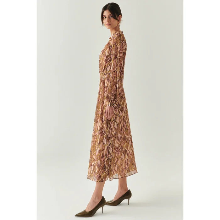 Standing out with its feminine and sophisticated details, the A-Line Pleated Brown Dress with Tie Detail offers a perfect combination of classic elegance and modern design. Thanks to its one-shoulder tie detail and fluid silhouette, it creates both a romantic and original style. While it adds a bohemian and romantic atmosphere with its fluid fabric, elegant pleats draped over the body and asymmetrical cut, it offers a timeless and classic elegance thanks to its brown tone. This special color, which emits a natural glow in daylight, helps you achieve a warm and sophisticated look. The one-shoulder design adds a minimal and artistic touch, creating a simple yet striking silhouette. The tie detail on the shoulder and the elegant floral embellishment give the dress a subtle luxury fashion feel.