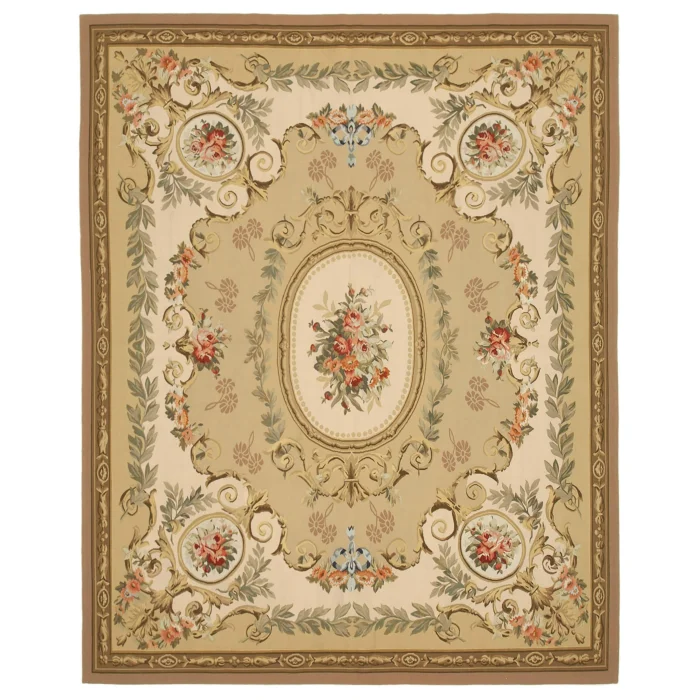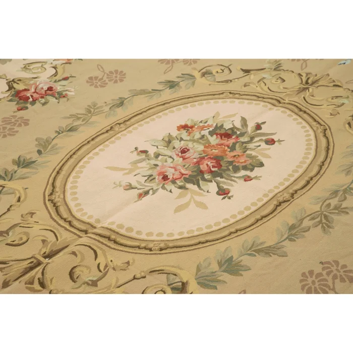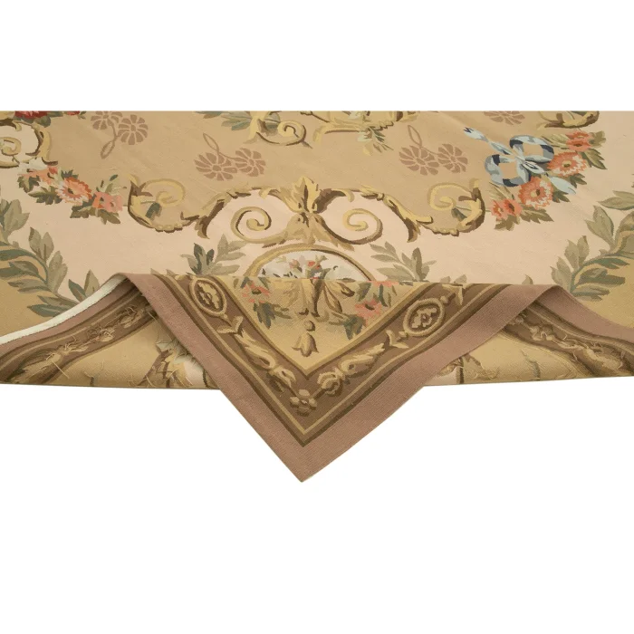 The Aubusson Rug is 265 cm wide by 336 cm long and about 5 mm thick. It weighs an average of 10 kg. It is made with hand-spun wool and cotton. It takes its colors from root dyes obtained naturally.