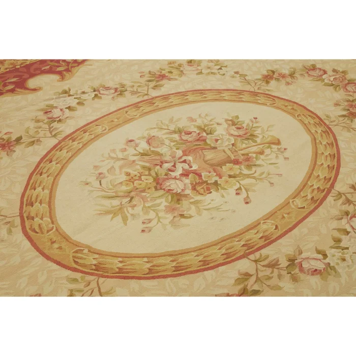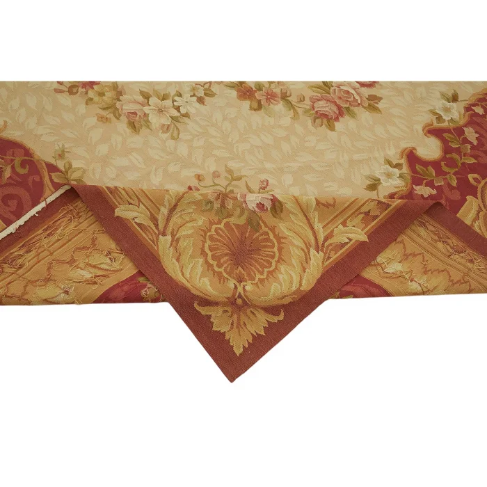 The Aubusson Rug is 270 cm wide by 380 cm long and about 5 mm thick. It weighs an average of 11 kg. It is made with hand-spun wool and cotton. It takes its colors from root dyes obtained naturally.