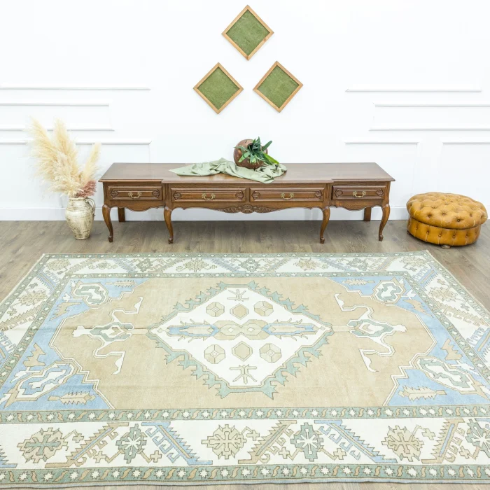 Soho Antiq hand-woven carpets and rugs are designed to breathe into your living spaces. This exquisite hand-woven rug is created by expertly combining carefully selected high-quality wool yarns. Produced using traditional handloom techniques, the carpet is specially designed to add warmth and elegance to your home. The color palette is inspired by the soft tones of nature, and while it draws attention with the harmony of green, cream and brown colors, it catches harmony with other colors in the carpet. The carpet was carefully woven by experienced handicraftsmen and produced in the 1980s with traditional techniques unique to the Aegean region, which adds a cultural depth to the carpet. The size of the carpet is measured as 211 x 300 cm, which allows the carpet to easily adapt to different living spaces. The thickness of the carpet is between 1 - 3 cm. Beyond its aesthetic value, this hand-woven rug stands out when it comes to adding authenticity and a traditional feel to your home.