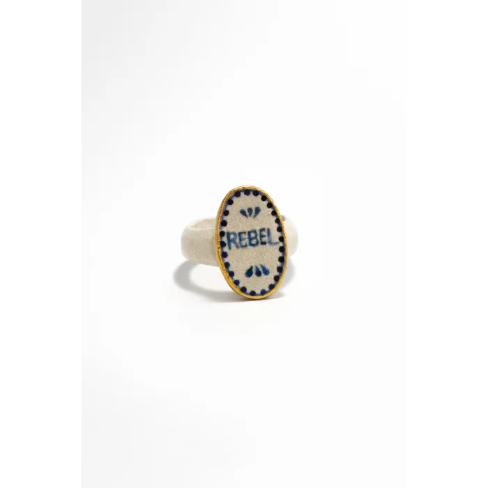Handcrafted ceramic ring featuring an oval “REBEL” emblem framed in gold.