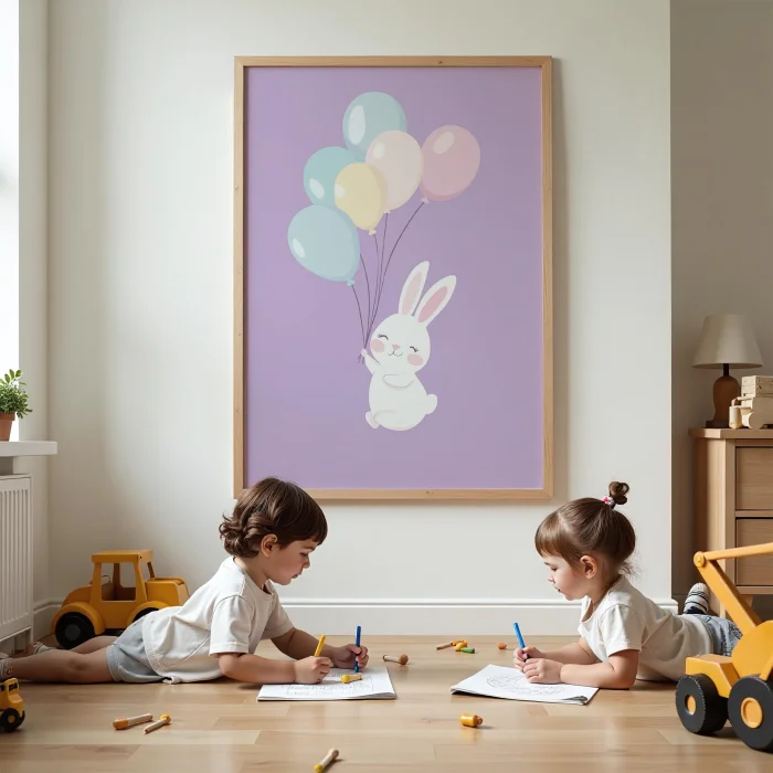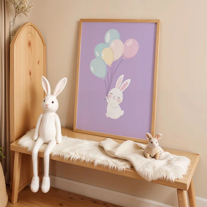 Product: With Baloon Flying Rabbit - Purple Background Children's Room Wooden Framed Wall Art