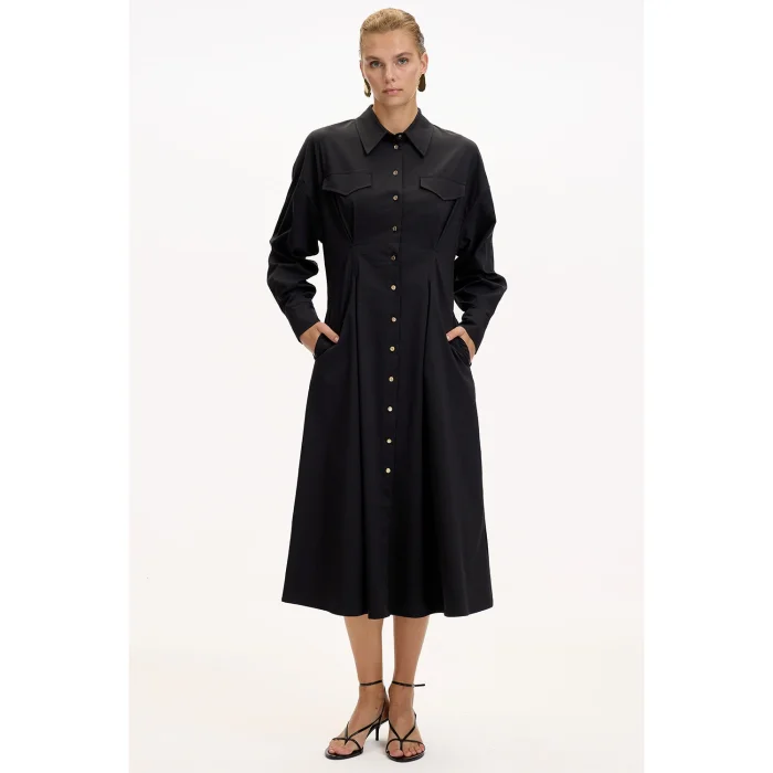 Product: Shirt Collar Long Sleeve Pocket Regular Buttoned Midi Dress