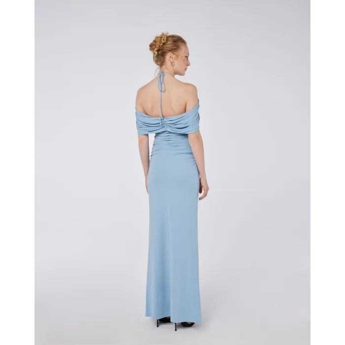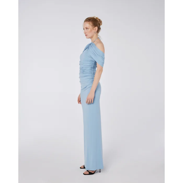 • Floor-length design with soft ruching for effortless movement and elegance.