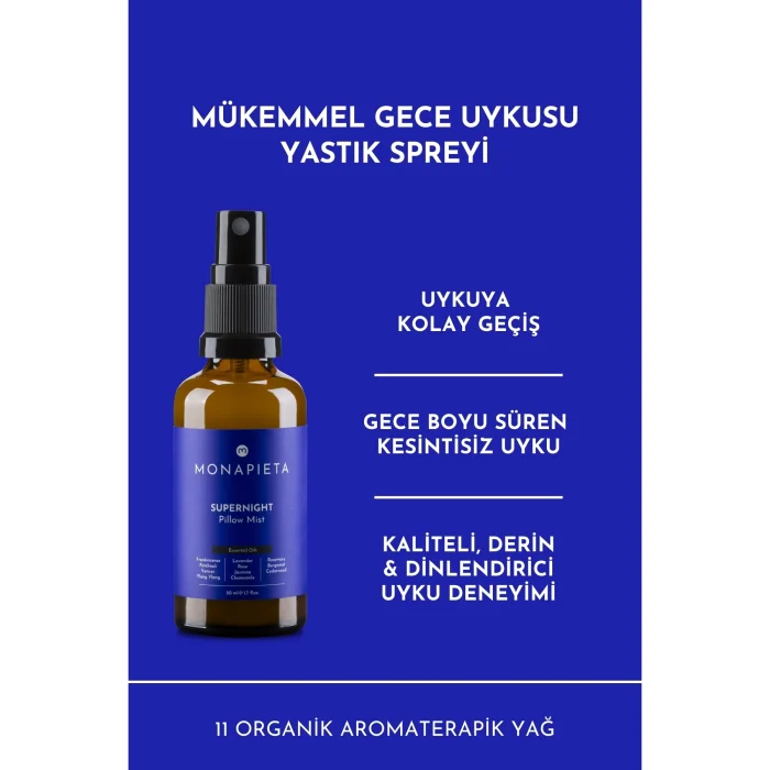 Monapieta Supernight Uyku ve Yastık Spreyi, mükemmel gece uykusu için özel 11 değerli organik esansiyel yağ içeriği ile uykuya kolay geçişe, gece boyu kesintisiz uykuya ve kaliteli, derin, dinlendirici bir uyku deneyimine yardımcıdır.