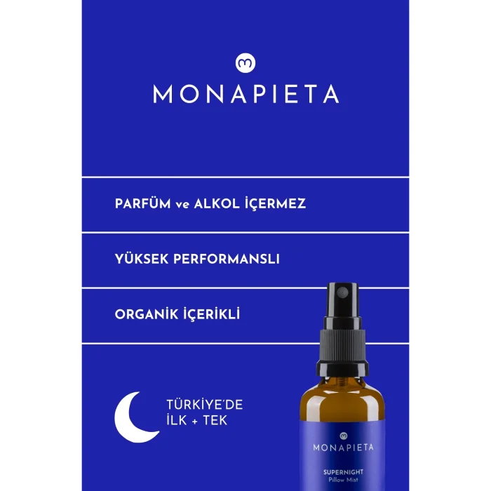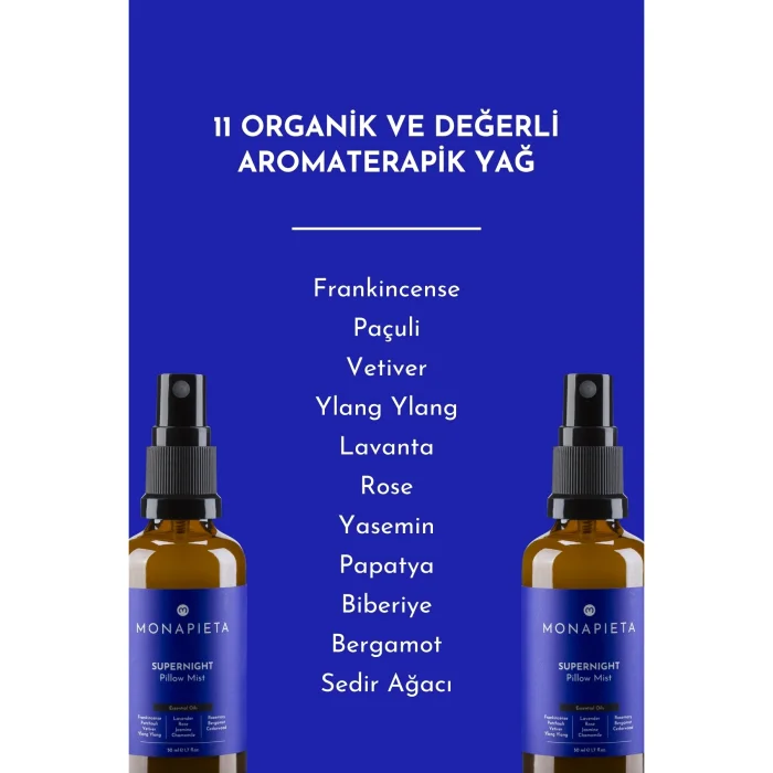 Perfect Night Sleep with Monapixela Superlight Pillow Spray =& Happy and Vigorous Mornings With a Perfect Combination of Specially Selected Organic Frankincense, Patchouli, Vetiver, Ylang Ylang, Lavender, Rose, Jasmine, Chamomile, Rosemary, Bergamot and Cedar & 11 Precious Essential Oils; - Easy transition to sleep,& - Uninterrupted sleep that lasts all night long, - It helps to have a quality, deep and restful sleep experience. It supports relaxation and relaxation with its pleasant and light scent coming from the organic essential oils in its content. It is enriched with organic aloe vera, which is both friendly to your skin and friendly to your pillow. Does Not Contain Perfume and Alcohol. It is housed in a healthy glass bottle. Set Contents Monapieta Perfect Night's Sleep Pillow Spray | 11 Precious Essential Oils | 50 ml x 2 pieces Uses Pillows Sheets Pajamas Laundry Rooms & Environments Usage Areas At home Holidays On travels On Journeys Everywhere... With its practical and easily portable size, it can be used comfortably anytime, anywhere... Clean Ingredients What's Inside? Organic Frankincense Essential Oil Organic Patchouli & Essential Oil Organic Vetiver & Essential Oil Organic Ylang Ylang & Essential Oil Organic Lavender & Essential Oil Organic Rose & Essential Oil Organic Jasmine & Essential Oil Organic Chamomile & Essential Oil Organic Rosemary & Essential Oil Organic Bergamot & Essential Oil Organic Cedar Wood & Essential Oil Organic Aloe Vera What's Not Included? Alcohol Perfume Toxic Chemicals Colorant Paraben Sulfate Phthalates Usage: Before going to bed, squeeze a sufficient amount from a distance of 30 cm onto your pillow and sheets. Warnings: Do not use in the presence of pregnant women, infants and people with respiratory diseases. Do not inhale directly, do not touch the body. It is used externally.