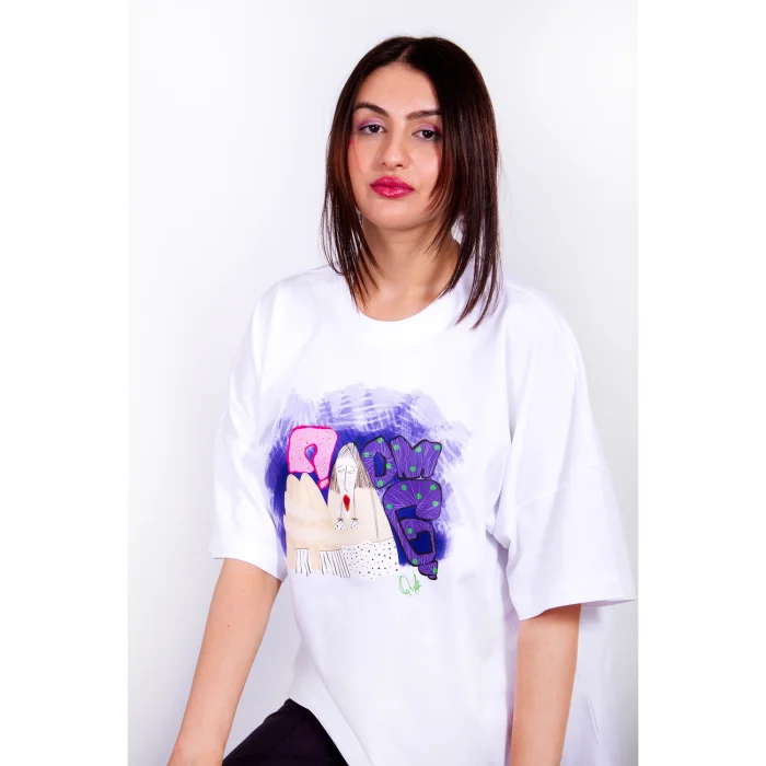 100% Quality Cotton: The best quality cotton fabric selected for maximum comfort. Edge Slit and Front Back Length Difference: A comfortable and stylish design that stands out with its modern cut. Product size : M/L Standard size, 75 cm Durable and Quality Printing: Special printing techniques that are long-lasting and maintain their colors for years. All Hand-Drawn and Unique: Each design comes to life with the original handwork of our artist E.Büşra TEKİN. Narrative Design: Each t-shirt tells a story and reflects the personality of the wearer. Get rid of the monotony of everyday life and highlight your style. Whether it's a casual occasion or a special event, you'll always stand out with QUFF. While it offers comfort all day long with its comfortable cut, it also complements your style with its original designs. Each t-shirt is designed with passion and carefully selected materials to give you a special experience. An ideal choice for those who care about both quality and style. Come on, spice up your style and express yourself in the unique world of QUFF. The key to your style is here!