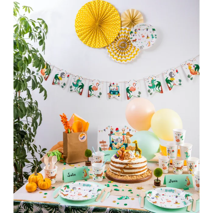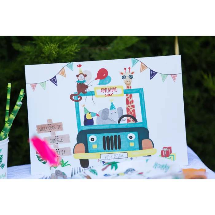 Centerpiece with safari car design, 24cm x 34 cm. 2 mm plaster on cardboard. On one side 4 color printing. Revers has easily opened and fixed support to hold it upright. Can be used as a service or art print on the wall.