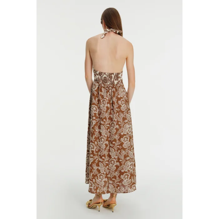 Halter Neck Low-cut Floral Patterned Linen Dress