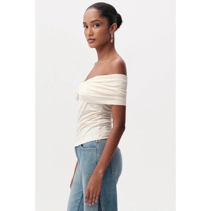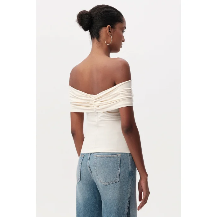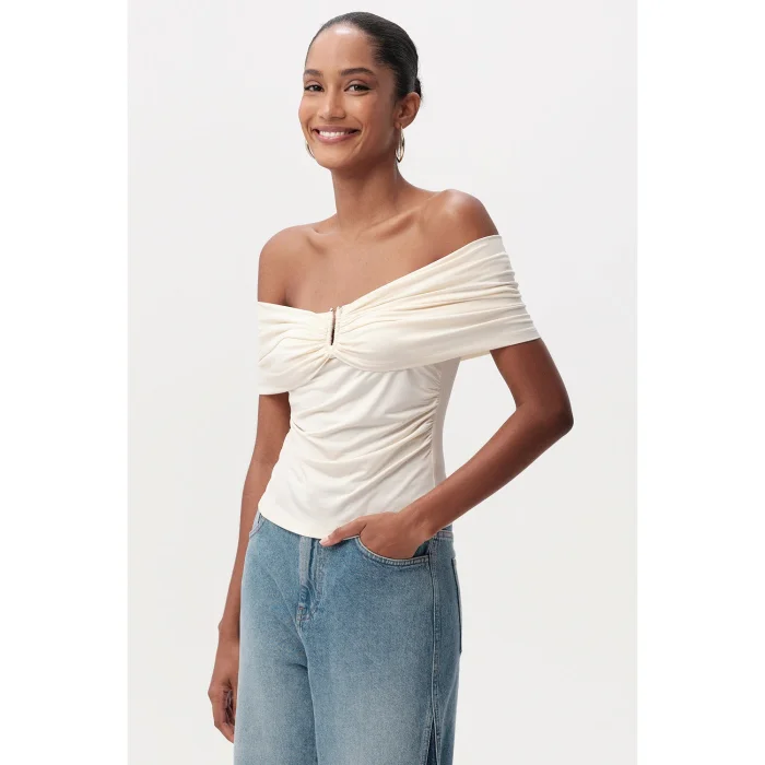 Slim Fit Knitted Cream Blouse with Off-the-Shoulder Metal Buckle is an ideal piece to have a special place in your wardrobe with its modern and stylish design. This blouse attracts attention with the soft texture offered by its knitted fabric and comfort that lasts all day long, while its slim fit cut creates a silhouette that elegantly emphasizes body lines. Cream color adapts to different styles with its structure that can be easily combined with bottom clothing products in both light and dark tones. The metal buckle detail on the front of the blouse adds a contemporary touch to the design, making the blouse more than an ordinary top and offering a unique style. Its off-the-shoulder design offers a feminine and elegant look, giving the product an attractive aesthetic. These features make the blouse preferred both for daily use and for special occasions. Whether you wear it with casual jeans and achieve everyday elegance, or combine it with a pencil skirt or stylish trousers in a more formal or private setting, this blouse offers versatile usage possibilities. Made from high quality knitted fabric, this blouse provides freedom of movement with its durability and flexible structure and is suitable for long-term use. With its gentle touch to the skin, it can also be preferred during seasonal transitions or cool evenings. Thanks to its slim fit cut, it is very easy to create layered combinations with outerwear pieces such as blazers, cardigans or leather jackets. The metal buckle detail and off-the-shoulder design make the blouse an indispensable choice for women who follow fashion and want to look stylish. You can always display an original and confident stance by creating different combinations with this specially designed blouse. Offering elegance and comfort together, this piece is a candidate to be one of the cornerstones of your wardrobe.