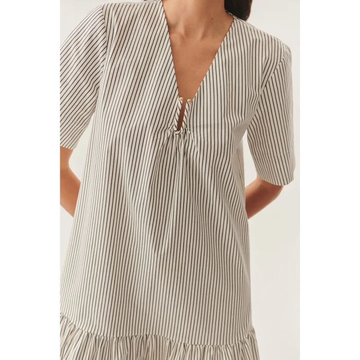 Product: Pleated, Relaxed Cut, Striped Cotton Dress With Buckle Detail On The Collar
