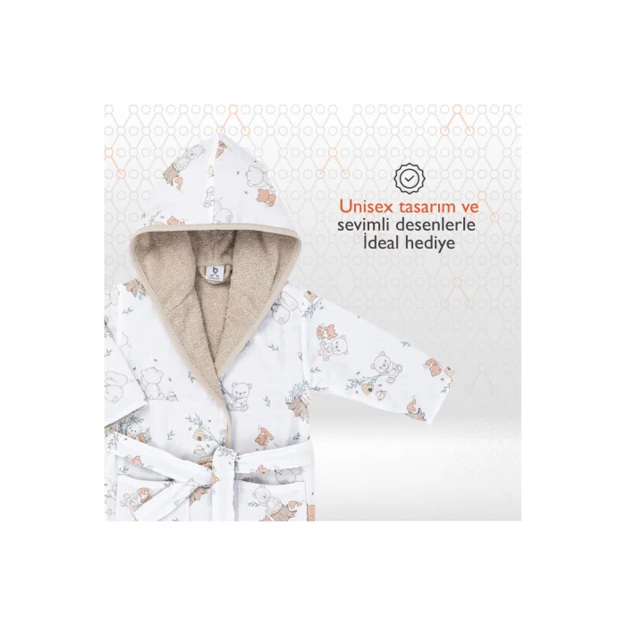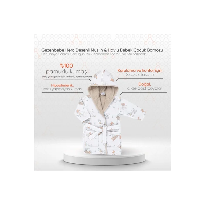 Product Description: Gezenbebe Hero Patterned Muslin & Terry Baby Children's Bornose: The Warmest Hug After Bath with Gezenbebe Heroes! Gezenbebe Hero Patterned Muslin & Towel Baby Children's Bornose has been carefully designed for the little ones to feel warm and comfortable after bathing. The outer surface of the bathrobe is decorated with unique patterns of Gezenbebe's cute heroes, Rabbit, Elephant, Teddy Bear and Koala, so your child has the opportunity to cuddle with these cute characters after bathing. On the inside, the pastel-toned terry cloth helps the little ones dry quickly, while at the same time wrapping them in a comfortable and soft touch. Both stylish and functional, this robe will make your bathing rituals more fun and comfortable. Prominent Features:GEZENBEBE SIGNATURE: With the beloved heroes of Gezenbebe, the little ones maintain their elegance after bathing. HIGH QUALITY FABRIC: Soft and breathable cotton fabric provides maximum comfort, protecting babies' delicate skin. It offers long-term use with its durable structure. WARM DESIGN: With its cute and warm patterns, it accompanies your child's most comfortable moments after bathing. SKIN FRIENDLY: Thanks to its hypoallergenic structure, it provides protection against allergic reactions. It is easy to clean and does not smell. PRACTICAL USE: The belted design allows children to put on and take off comfortably and move freely. IDEAL GIFT OPTION: It is a perfect gift alternative for both girls and boys with its unisex design. NATURAL DYE: Water-based dyes that do not harm the skin are preferred in prints. CUSTOMER FOCUS: We are constantly improving our products with customer feedback, and we aim to provide excellent experience in quality and comfort. Technical Details:Material: Our bathrobe is made from the perfect combination of muslin fabric and ultra-soft towel, which is known for its lightness and breathability. Intended Use: Ideal for keeping your child's body warm and dry after bathing or swimming. It provides both drying and comfort. Color Options: Bunny (Rabbit), Elephant (Elephant), Koala (Koala) and Teddy (Teddy)Product Sizes: 1-2 Years, 2-4 Years.Care Instructions: Wash at 30 degrees and dry without exposing to direct sunlight. Let your child's post-bath moments be both comfortable and stylish with Gezenbebe Hero Patterned Muslin & Towel Baby Kids Bathrobe. Choose the best for him, experience the quality of Gezenbebe.