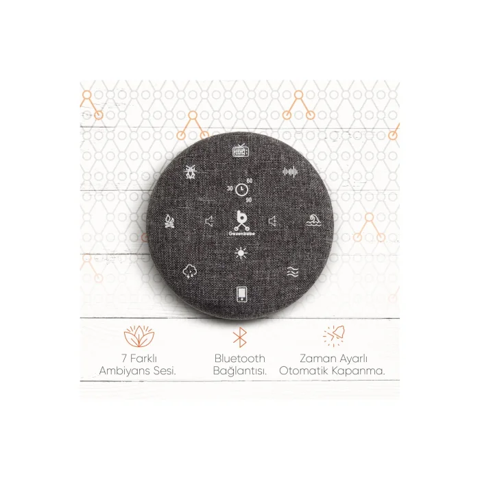 Product Description:Gezenbebe White Noise Baby Speaker - Sleep and Concentration AidBaby Speaker Specially Designed for Babies' Sleep! Designed for a peaceful sleep experience of our babies, Gezenbebe White Noise Baby Speaker will be an indispensable part of your home. Exclusive white noise technology allows your baby to sleep comfortably and offers stress-reducing and focus-enhancing effects for our parents. While Gezenbebe's original design adds an elegant touch to modern home decorations, it can be easily carried anywhere with its compact and lightweight structure. Salient Features:ORIGINAL DESIGN AND PORTABILITY:Gezenbebe's stylish and modern design adapts to any environment. With its compact and light structure, it is also with you on travels. SPECIAL WHITE NOISE FOR BABIES: 7 different natural and calming sounds that help babies sleep faster and deeper. Storms, campfires, summer nights, TV and radio noise, ocean waves, flowing streams, calm your baby and block out disturbing ambient sounds. IDEAL FOR PARENTS: Perfect not only for babies, but also for adults. It relieves stress, relieves anxiety, and increases focus. BLUETOOTH CONNECTION: Easily connect your device to listen to your favorite podcasts and music. Enjoy a comfortable listening experience while your baby sleeps. TIMED AUTO SHUTDOWN: 30, 60, 90-minute auto-off features make your sleep routines easier. MULTIFUNCTIONAL LIGHTING: Create a relaxing atmosphere with 7 different ambient lights and 3 levels of white light. RGB light makes it easy to care for at night. For a peaceful sleep experience for our babies and a calm mind for our parents, try the Gezenbebe White Noise Baby Speaker now!