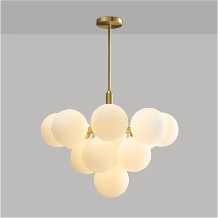 The Glop Pendant Chandelier gives spaces a strong and modern aesthetic by hanging opal glass in a row in a form resembling a bunch of grapes. Opal white lenses distribute light softly and homogeneously, providing warm lighting that does not strain the eyes.