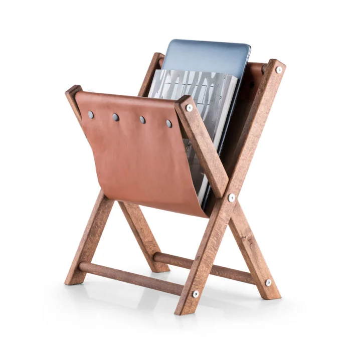 Hexo Newspaper/ Magazine Holder is made of beech and natural leather. The edges and curves of wood reveal the excellence in workmanship. Brown natural leather is in perfect harmony with the wood surface. Simple, stylish and modern. Dimensions are designed to fit the furniture in your living or working space.