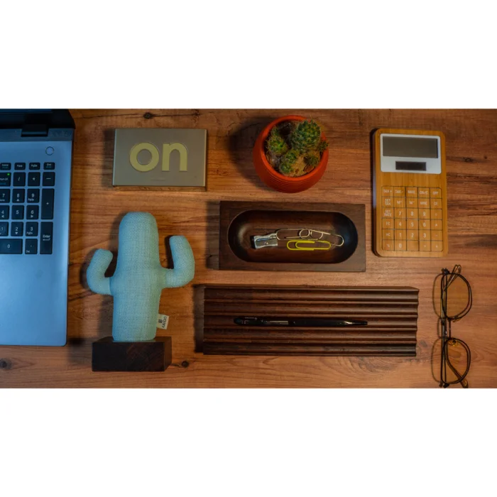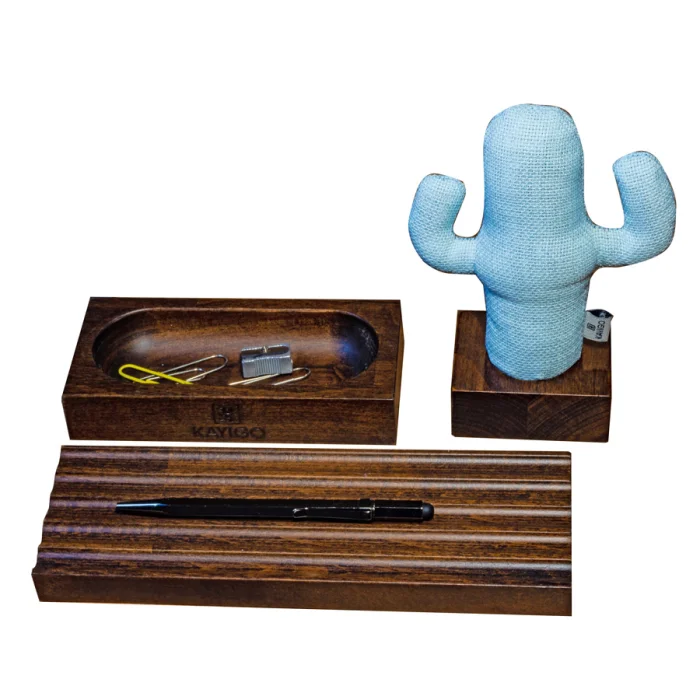 It comes with a pen holder, an organizer and a cactus note holder. Since wood is a natural material, it can show pattern and color differences.