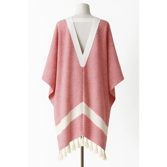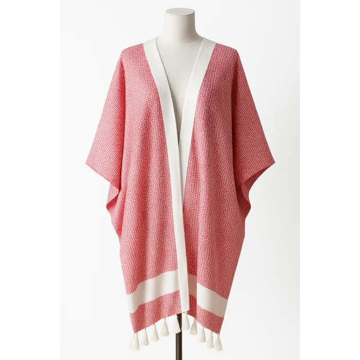 Show off your elegance at the beach! This stylish kimono takes your summer style one step further with its pink and white details. With its flashy tassels at the hem and its modern design, it is a piece that can be worn comfortably on the beach. Its breathable fabric and lightweight structure offer you comfort on hot days, while its pink fabric and white thin lines create an elegant elegance. An excellent option to complement your beachwear on your summer vacation. Ideal for accentuating your cozy and glamorous style, this kimono will make every moment stylish, from the beach to the poolside to summer evenings.