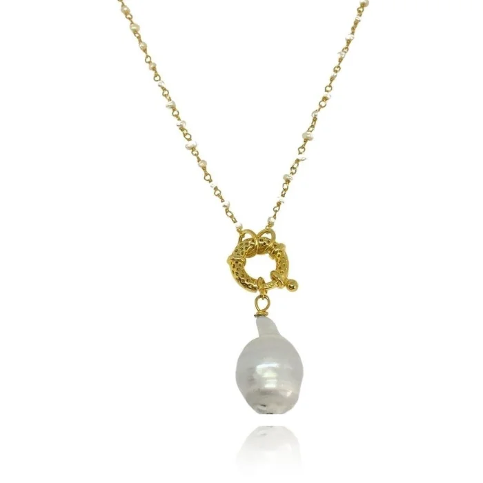 Pretty Pearl Chain Necklace Each link of the chain necklace is made of 925 sterling silver and has gained a perfect shine with gold plating. This necklace stands out thanks to the natural beauty of baroque pearls and their unique shape. Each pearl offers a touch that enhances the elegance and glamour of the necklace. This eye-catching necklace is a great option for those looking for elegance. You can choose this unique and stylish jewelry to pamper yourself or your loved ones. The gold-plated baroque pearl chain necklace on 925 silver can be a special gift option that appeals to all ages and tastes, and it leaves an unforgettable mark by emphasizing your style. Pretty Pearl Chain Necklace Features: 925 sterling silver; 22K Gold plated; Necklace Color: Gold; It is made with real baroque pearls. ; The baroque pearl on the pendant is removable. ; Approximate Necklace Length: 50 cm; Adjustable length (with a 2 cm long extension chain on the back of the necklace); Approximate Silver Weight: 10,51 gr ;