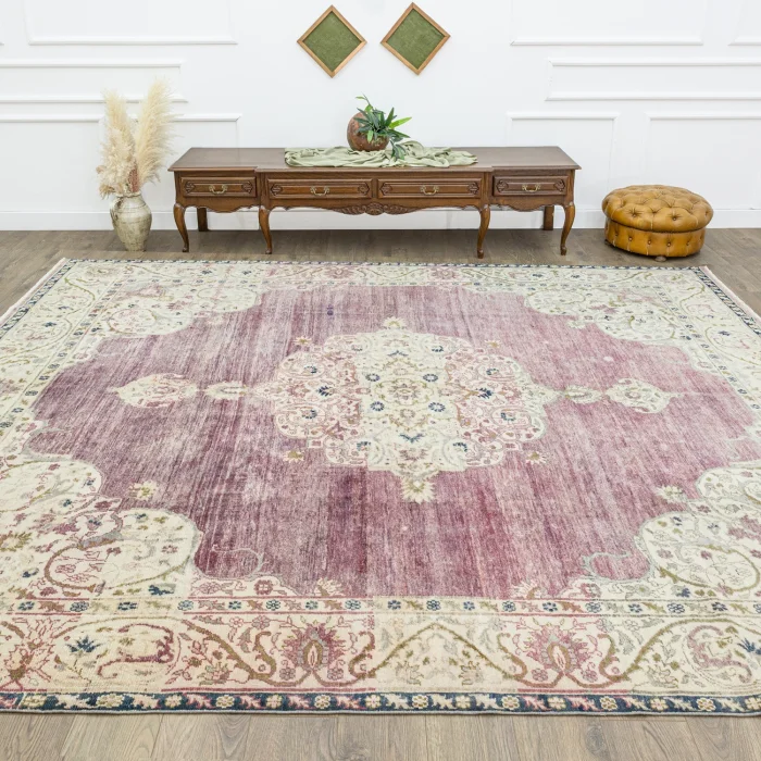 With their flamboyant and aesthetic designs, our Soho Antiq carpet models will add a new atmosphere to your living space! Our long-lasting carpet model consists of completely natural cotton and wool and is woven with a special hand weaving technique. This carpet, which we produce with the skills that make the carpet model special and ensure that it maintains its quality over the years, has a thickness of 1 to 3 cm and its length is 266 x 350 cm. Thanks to the shaving process applied to the carpet after weaving, the pile height has been reduced to a minimum, which gives the carpet a smooth and modern appearance. The main color of the carpet you choose among the carpet models with many color options is pastel pink. In addition, other colors found in the carpet design are beige, blue and multicolored. Soho Antiq features carpets with cultural and traditional features. This carpet model, which has come from the past to the present, bears traces of the history of the 1970s and has cultural colors and touches, especially from the Isparta region. It is possible to see all these traditional touches in the medallion pattern on the carpet.