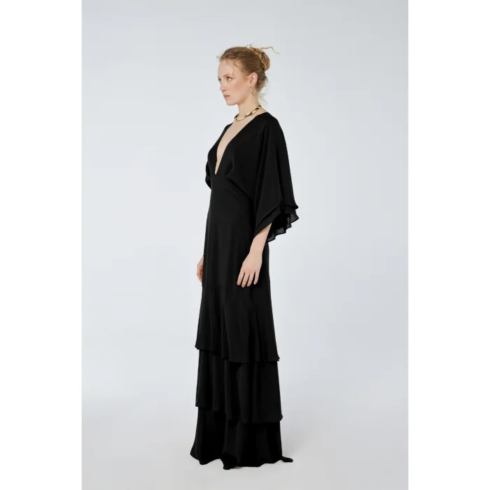 A sophisticated yet effortless gown, blending structured femininity with soft, flowing layers for a refined statement look.